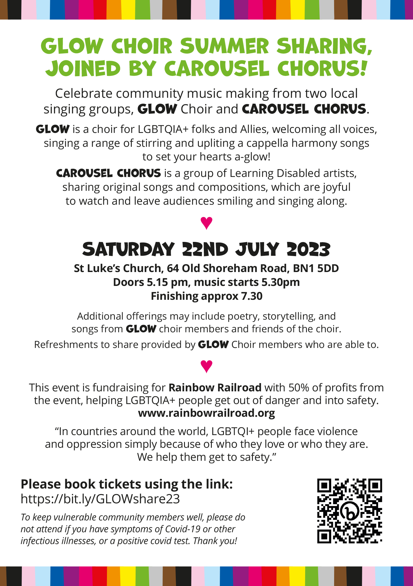 Celebrating community music making, and supporting the very important work of Rainbow Railroad, helping LGBTQIA+ people get out of danger and into safety.