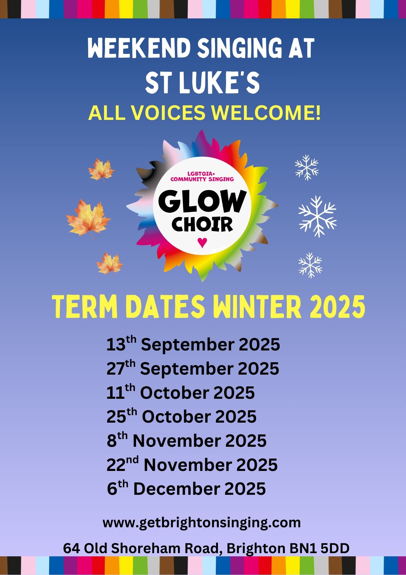 Image above (Left) reads: Weekend Singing at St Luke’s, All Voices Welcome. Term Dates Winter 2025. 13th September 2025, 27th September 2025, 11th October 2025, 25th October 2025, 8th November 2025, 22nd November 2025, 6th December 2025. http://www.getbrightonsinging.com. 64 Old Shoreham Road, Brighton, BN1 5DD.