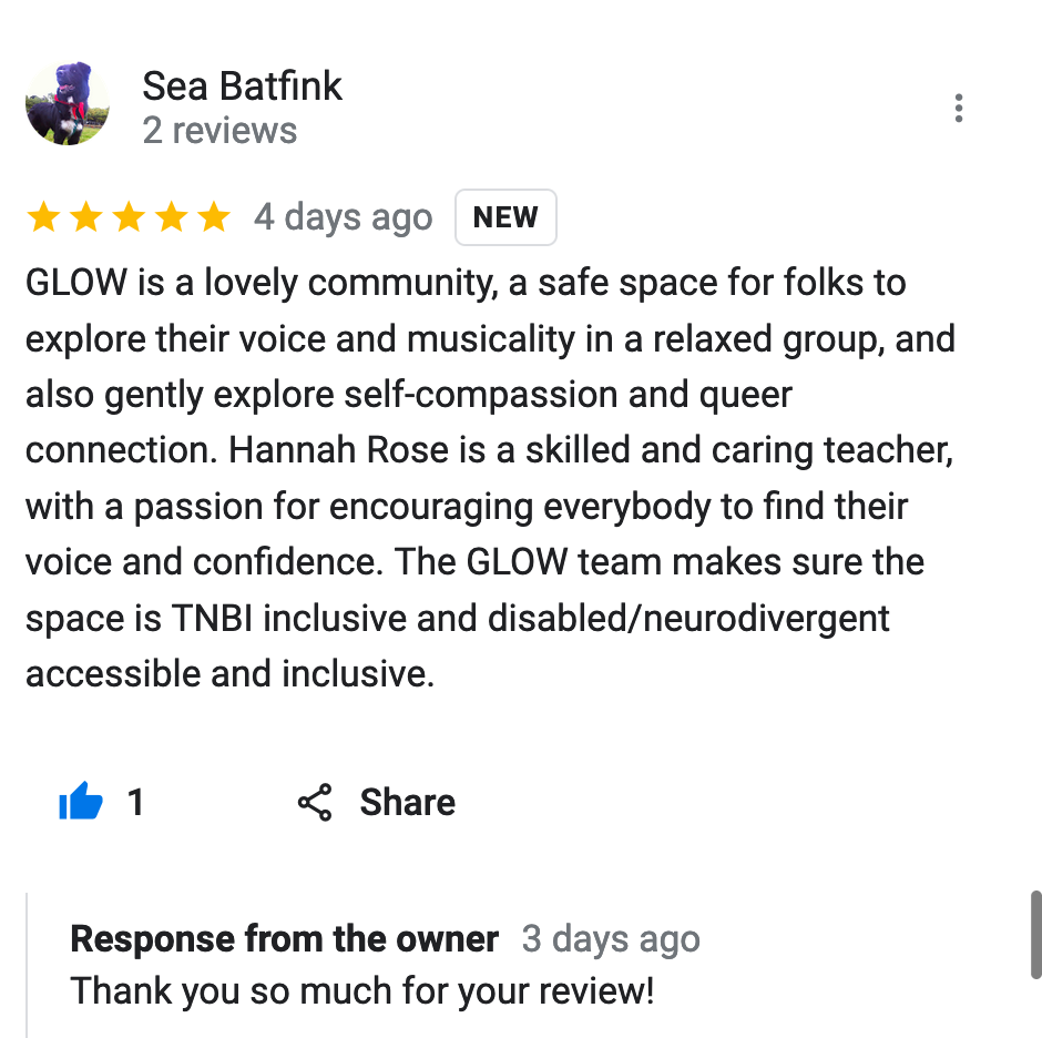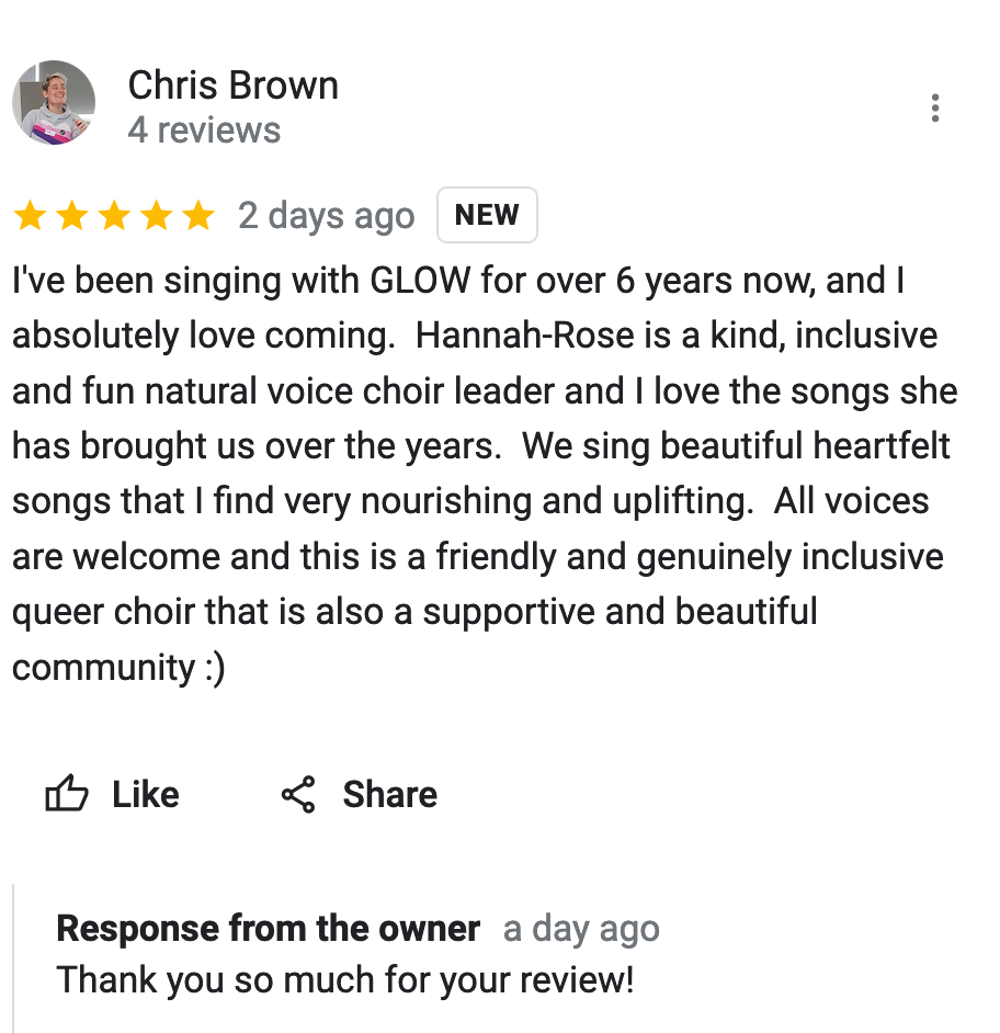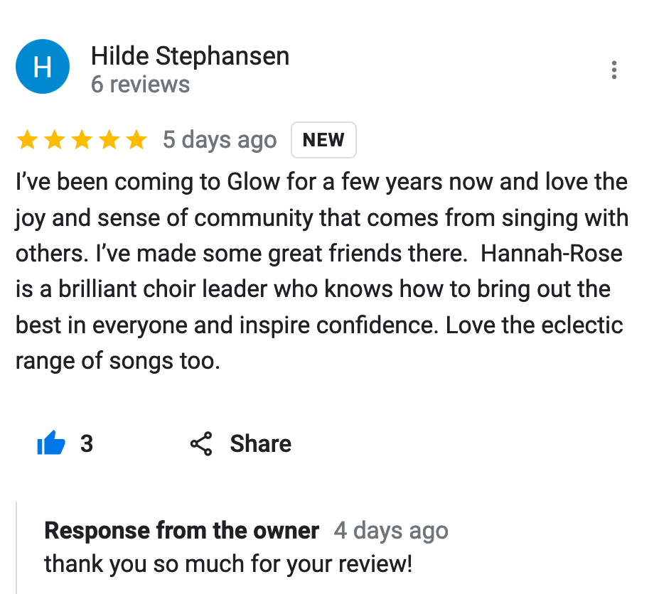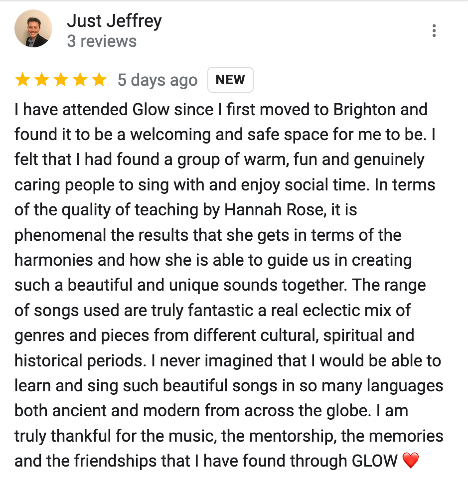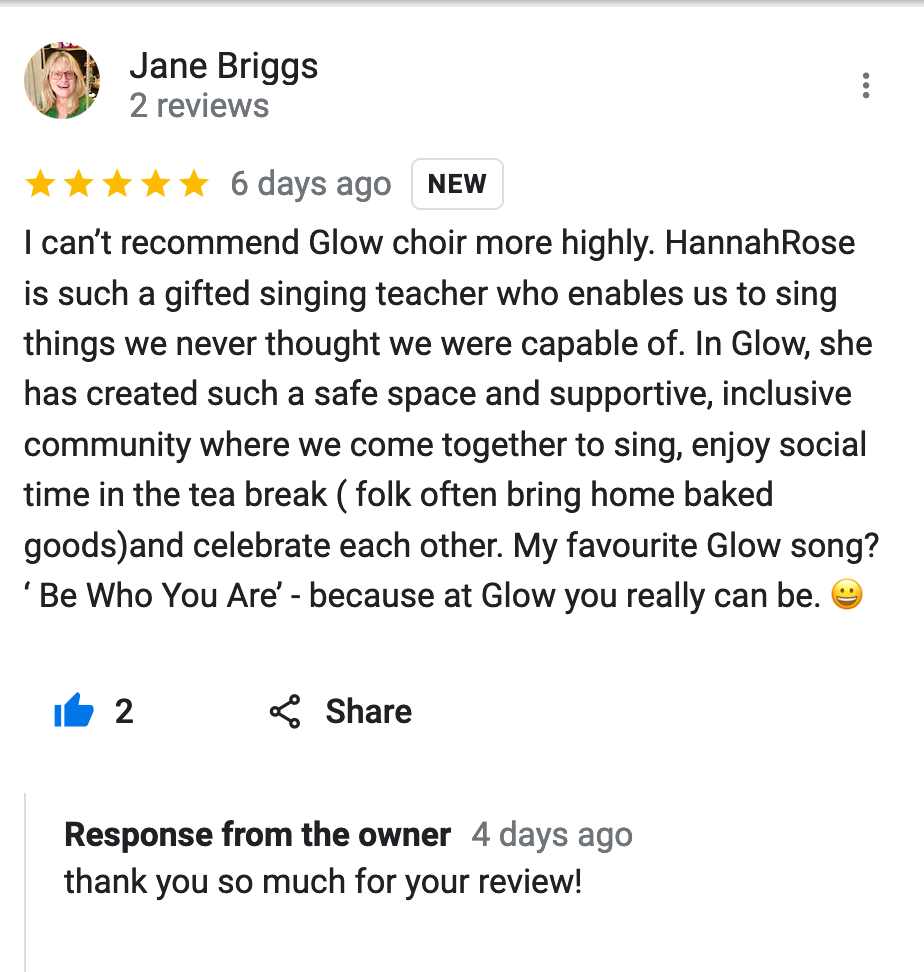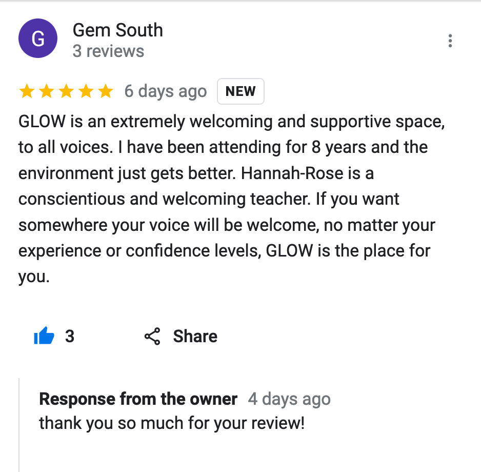 Since singing with you I have started singing in a band and am really grateful for the confidence that your Glow sessions gave me.” Spam