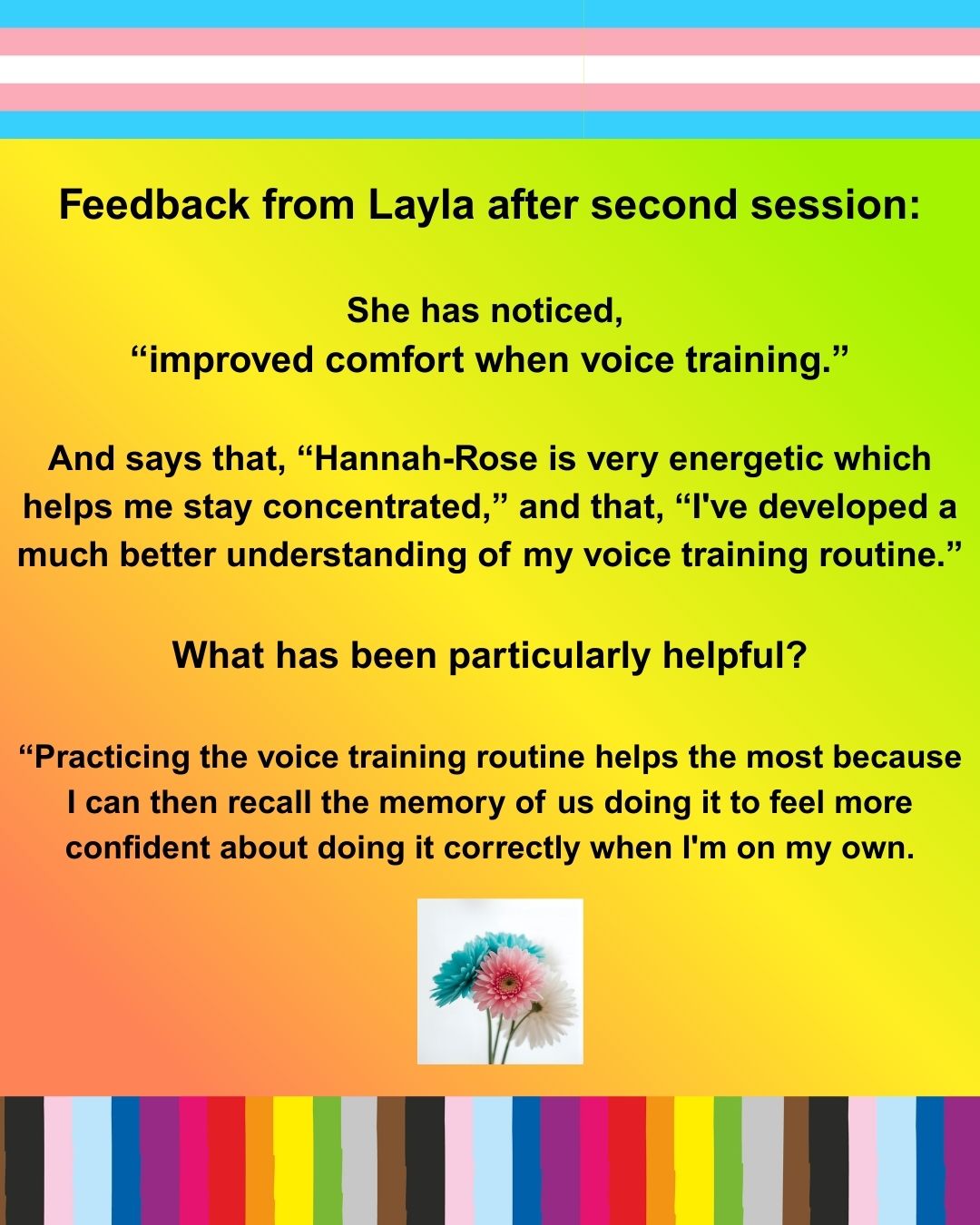 She has noticed, “improved comfort when voice training.” And says that, “Hannah-Rose is very energetic which helps me stay concentrated,” and that, “I’ve developed a much better understanding of my voice training routine.”