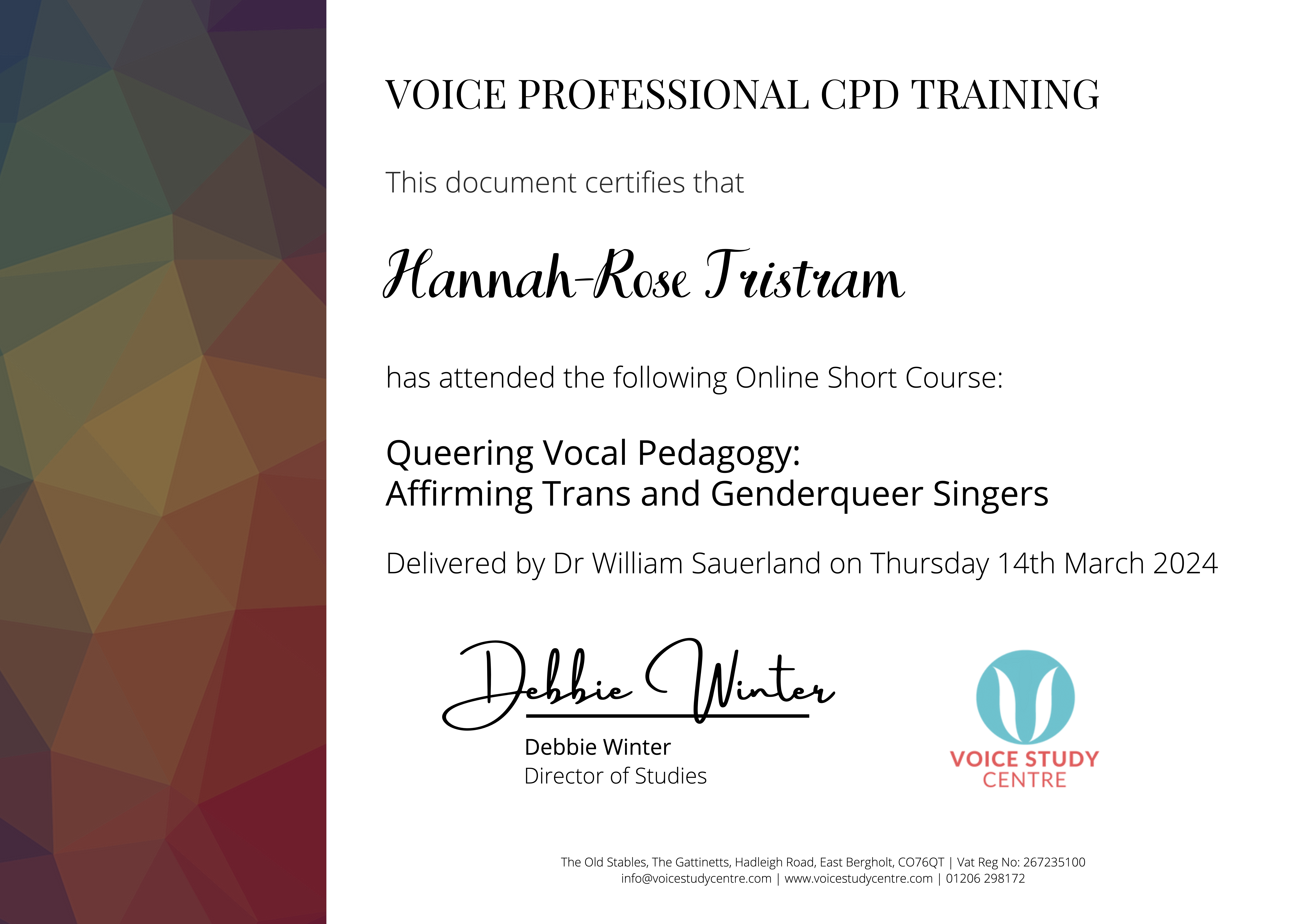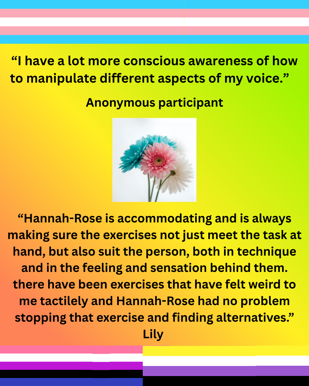 I’m thrilled to be offering gender affirming voice coaching and trans voice alteration. I’ve been studying in various ways this area of practice that I am passionate about, and have recently finished a brilliant teacher training course with the wonderful Renée Yoxon.