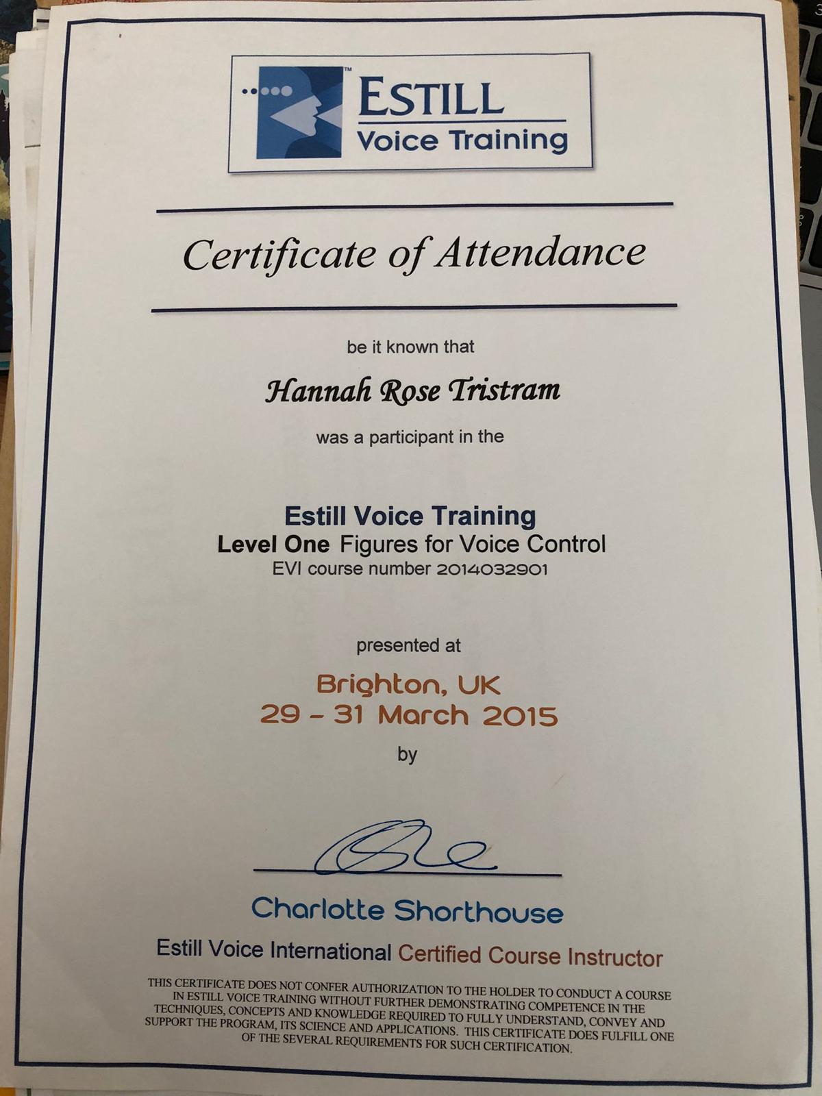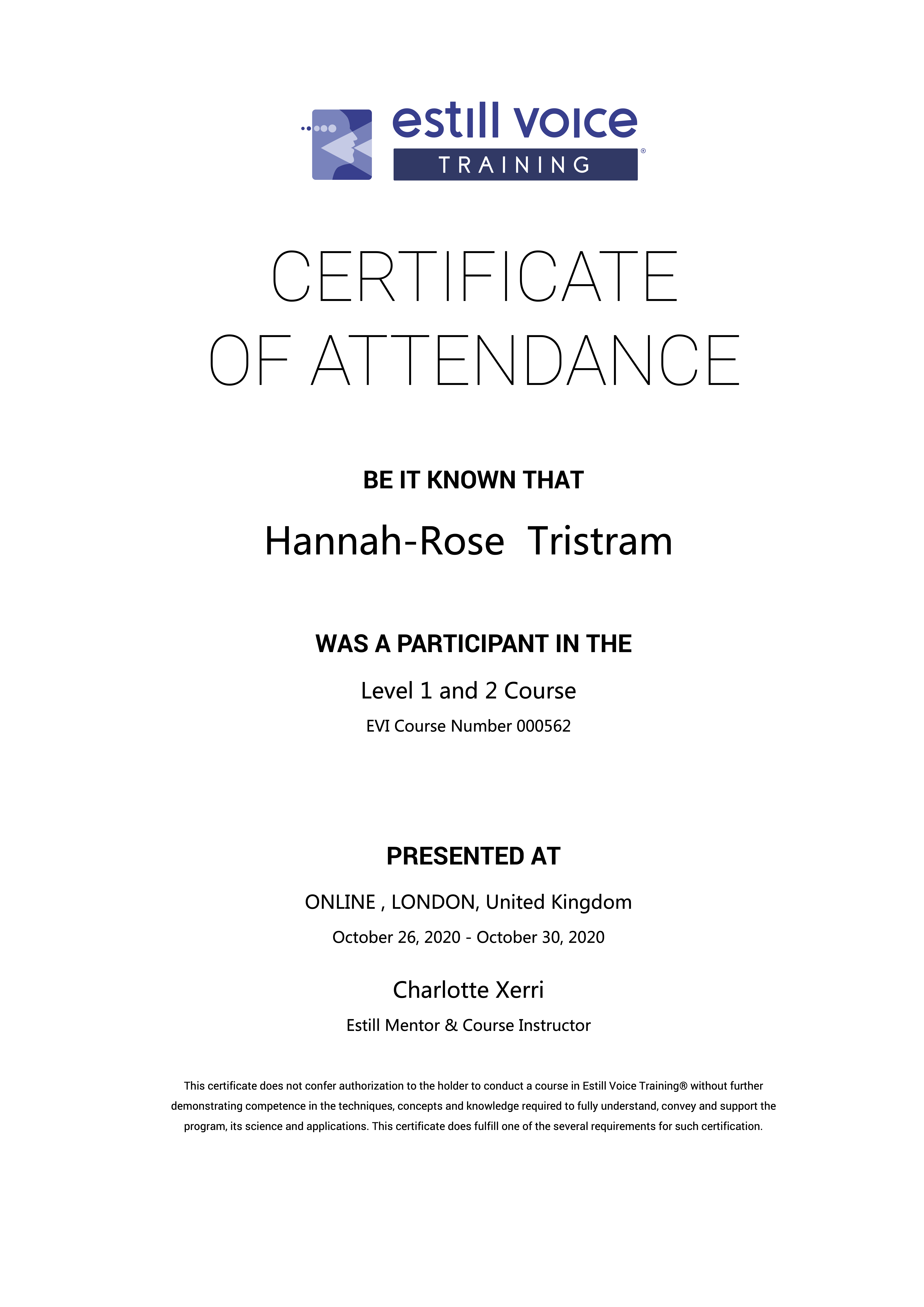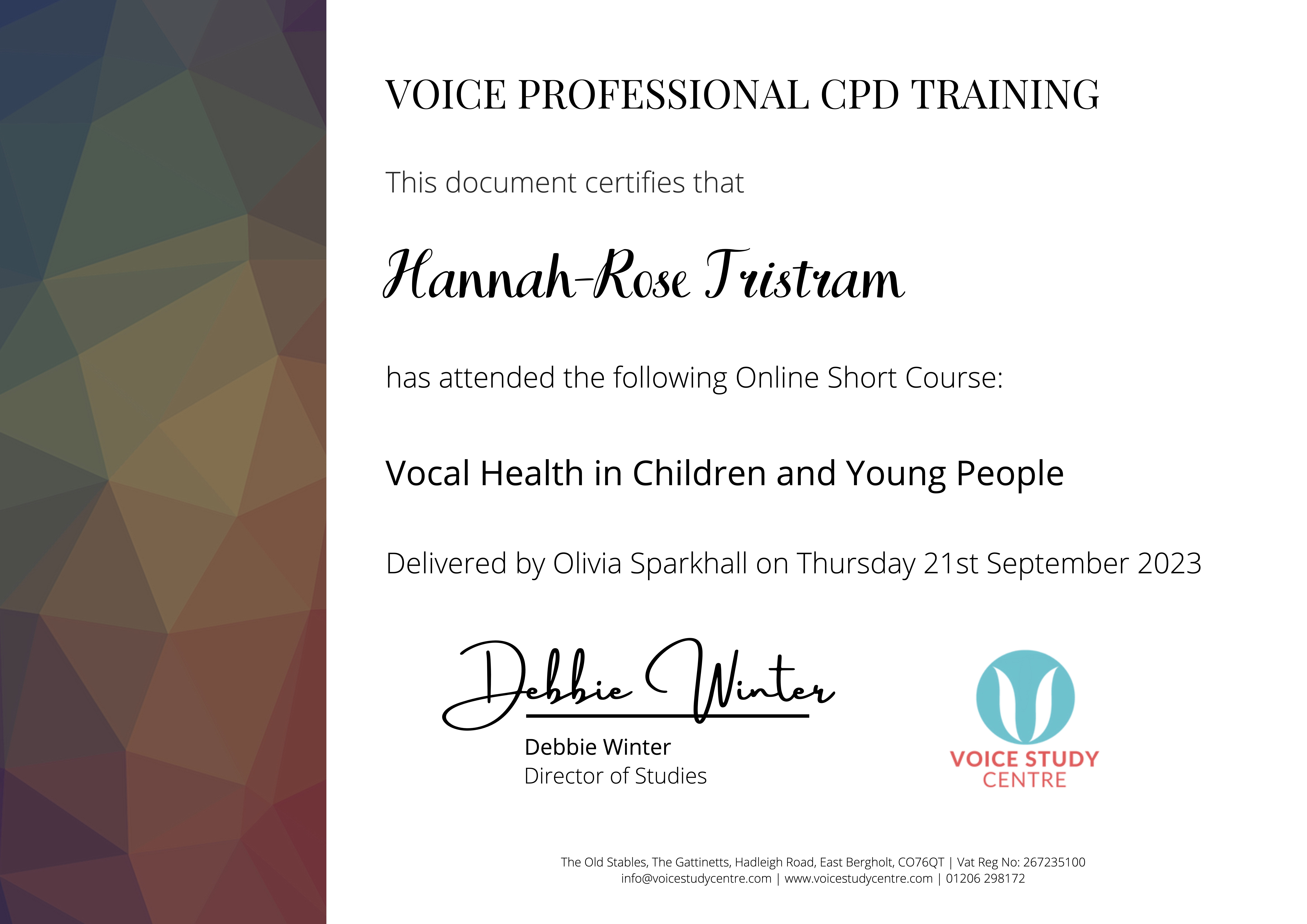Hannah-Rose’s approach is enriched by ongoing study and previous informal and formal study, with the latter including Estill Voice Training (2015, 2020), NVN teacher training (2007), and studies in vocal health, singing for health, music, dance, and yoga.