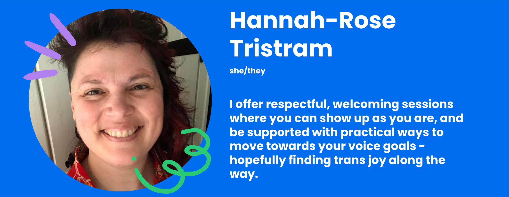 With 20 years of voice teaching experience, Hannah-Rose now specializes in supporting trans, non-binary and gender-diverse people to align their voices with their sense of self, and build habits that feel right to them.