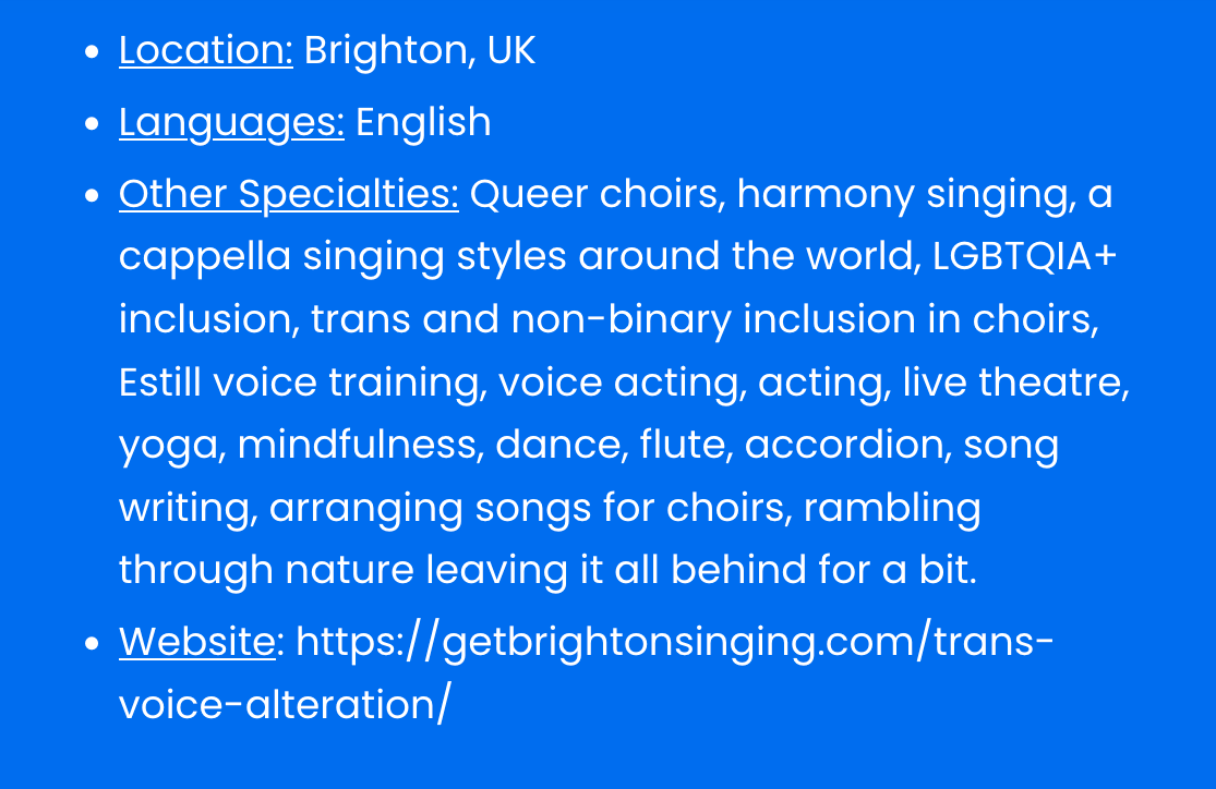 The info above is from my listing in Renée Yoxon’s trans voice teacher directory.