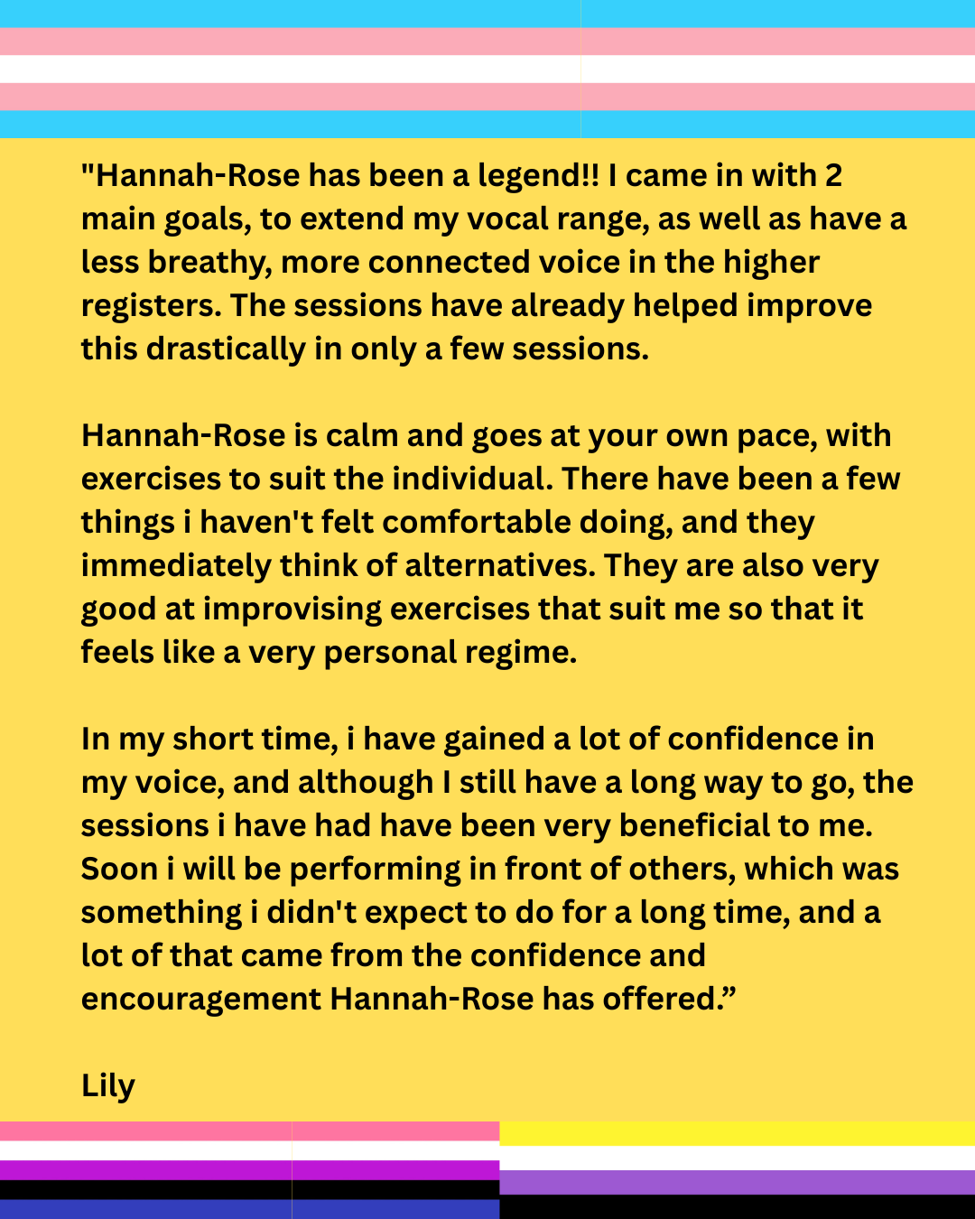 -“Hannah-Rose has been a legend!! I came in with 2 main goals, to extend my vocal range, as well as have a less breathy, more connected voice in the higher registers. The sessions have already helped improve this drastically in only a few sessions. Hannah-Rose is calm and goes at your own pace, with exercises to suit the individual. There have been a few things i haven’t felt comfortable doing, and they immediately think of alternatives. They are also very good at improvising exercises that suit me so that it feels like a very personal regime. In my short time, i have gained a lot of confidence in my voice, and although I still have a long way to go, the sessions i have had have been very beneficial to me. Soon i will be performing in front of others, which was something i didn’t expect to do for a long time, and a lot of that came from the confidence and encouragement Hannah-Rose has offered.” Lily