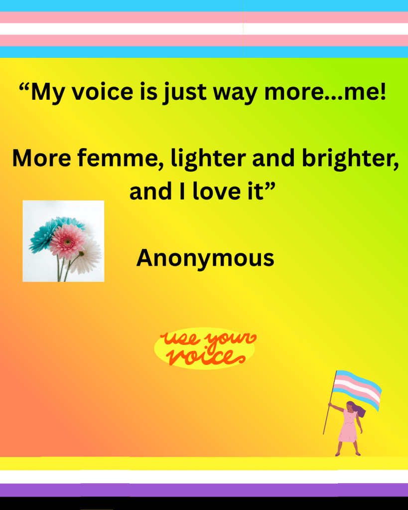 More femme, lighter and brighter, and I love it” Anonymous. On a green, yellow and orange background, with non-binary flag at the bottom and trans flag at the top, and below the words, flowers in trans flag colours, a graphic saying ‘use your voice’, & an image of somebody waving a trans flag.